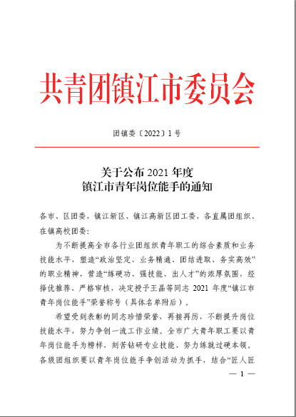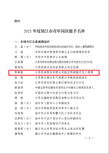 為不斷提高全市各行業(yè)團(tuán)組織青年職工的綜合素質(zhì)和業(yè)務(wù)技能水平,塑造“政治堅(jiān)定、業(yè)務(wù)精通、團(tuán)結(jié)進(jìn)取、務(wù)實(shí)高效”的職業(yè)精神,營(yíng)造“練硬功、強(qiáng)技能、出人才”的濃厚氛圍,經(jīng)擇優(yōu)推薦、嚴(yán)格審核,恒神股份研發(fā)工程師郭聰聰榮獲“2021年度鎮(zhèn)江市青年崗位能手”稱號(hào)。